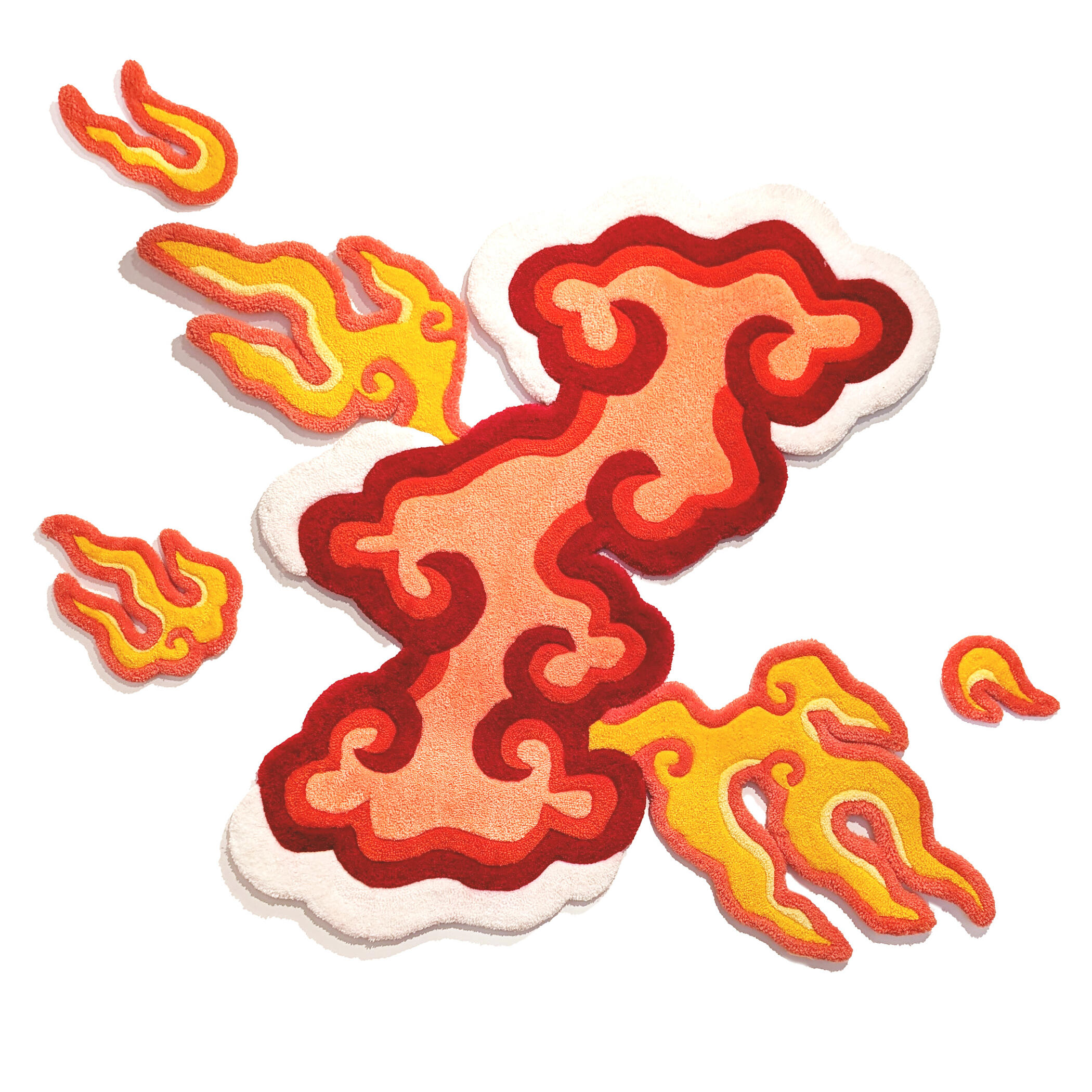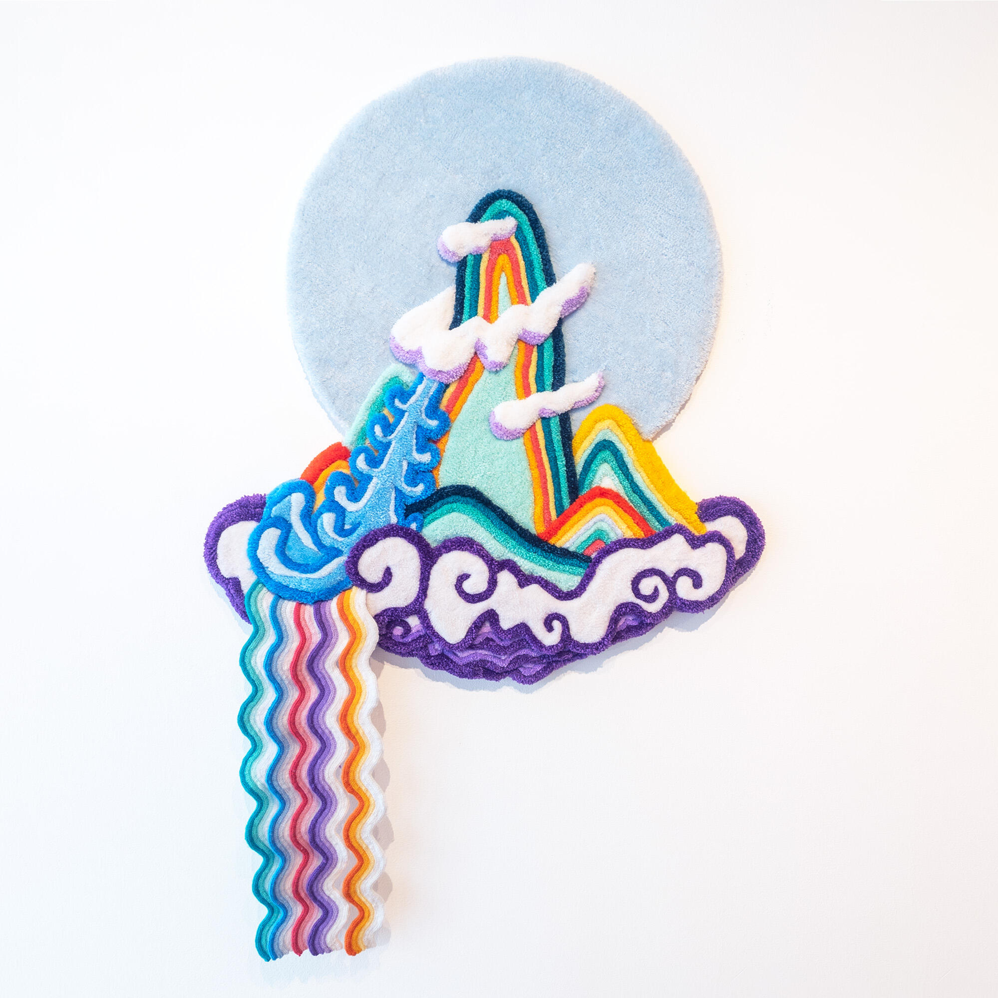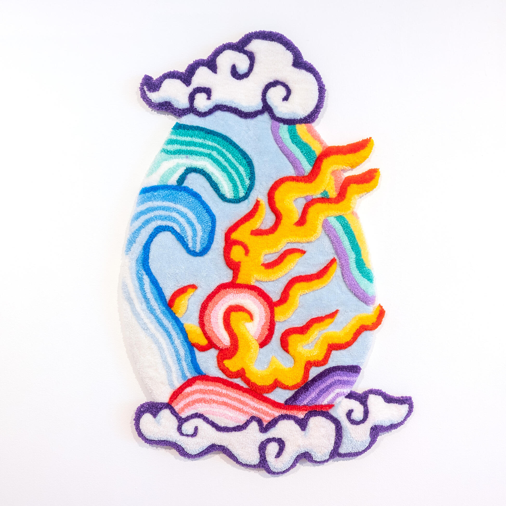 Chaos and DelightAccording to Chinese mythology, the universe began as a roiling primordial chaos trapped inside an egg. The god Pángǔ cracked open the egg and with great effort, separated the chaos and pressed the heavens and earth into their orderly place we see today.These tufted works depict the elements mid-formation, suggesting there can be delight amidst chaos